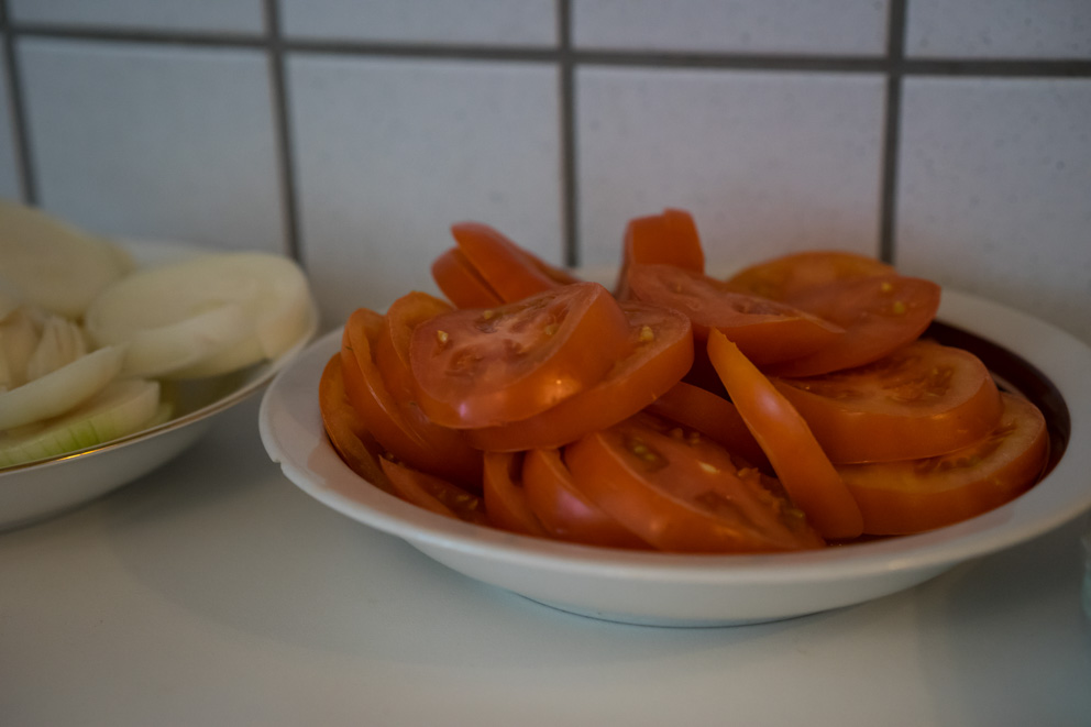 Ein simples Rezept. Es stammt nicht aus einem Kochbuch oder ähnlichem, sondern wurde uns von Nawfal mündlich weitergegeben. Gemüse kleinschneiden und alles zusammen in eine große Schüssel geben. Olivenöl darüber gießen. Ketchup hinzugeben und gründlich vermischen. Zitrone schneiden und auspressen.